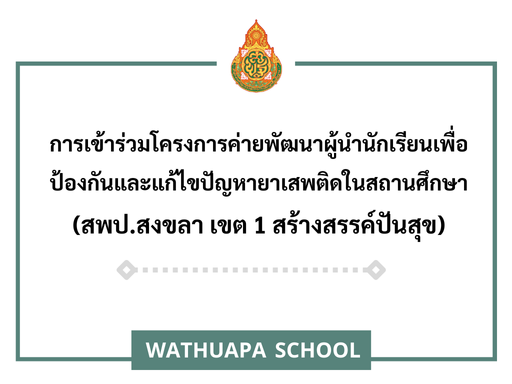 การเข้าร่วมโครงการค่ายพัฒนาผู้นำนักเรียนเพื่อป้องกันและแก้ไขปัญหายาเสพติดในสถานศึกษา (สพป.สงขลา เขต 1 สร้างสรรค์ปันสุข) ในวันที่ 9 – 11 กันยายน พ.ศ. 2567 ณ ค่ายทหารกรมหลวงสงขลานครินทร์ กองพันทหารราบที่ 8 กองพลนาวิกโยธิน ตำบลบ่อยาง อำเภอเมืองสงขลา จังหวัดสงขลา โดยมีตัวแทนนักเรียนในระดับชั้นมัธยมศึกษาปีที่ 1 – 2 เข้าร่วมโครงการจำนวน 6 คนและคุณครูผู้ควบคุม 1 ท่าน